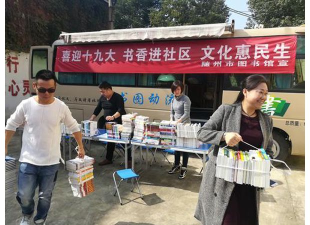 随州网讯 10月21日,随州市图书馆开展“喜迎十九大书香进社区文化惠民生”活动,将装载着3000多册图书的流动图书车开到了曾都区北郊黄龙社区,把缕缕书香送到千家万户,丰富社区居民的业余文化生活。(本报记者 陈巧玲 通讯员 丁庆芬摄)