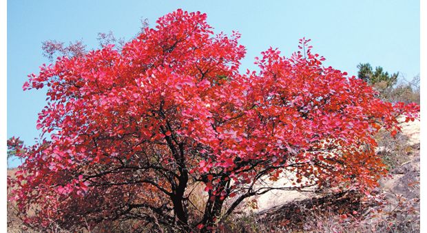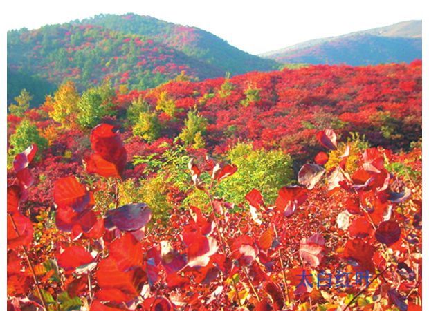 那是一个风和日丽、秋高气爽的下午。山路崎岖,沟壑纵横,进入我们视野的是看似近实则远的桐柏山太白顶下的盛家寨,在红叶簇拥下,更显示出古朴苍桑之美。我们顺着蜿蜒起伏的山路,爬上了山顶。山岭上生长着茂密的天然次生林,植物种类繁多,有几十种秋天红叶的植物。每到中秋轻霜过后,漫山遍野层林尽染,赤橙黄绿紫,争色斗艳,但红得鲜艳、红得热烈、红得美丽、红得时间最长数黄栌、五角枫和三角枫。漫山红叶中,最大的家族要数黄栌,最漂亮的当属五角枫。经霜一点鲜红亮丽,不掺杂色,鲜艳持久,红得让人难以相信是自然生成。举目眺望,沟沟垴垴,山山巅巅,簇拥相依,片片相连,漫山遍野的红叶扑面而来,如霞似火,流光溢彩,镶嵌着松树、萃柏的树叶鲜绿如夏、色彩斑斓的森林之中,显得更加层次分明,错落有致。还有那以菊科为主秋天开放的各种野花,在林下、在路旁、在溪边,争芳斗艳。绚丽挺拔的桐柏山把这五颜六色的山岭和那蓝天白云一同揽入她那宽阔的怀抱之中,我似乎走进了安徒生的童话世界。在这色彩斑斓的世界里,最亮丽、最显眼、最让人喜爱的便是红叶,像一朵朵明艳欲滴的彩霞,像一团团燃烧跳动的火焰,让人炫目,让人留恋,让人震撼,让人肃敬,让人遐想,让人寄托美好的向往和淡淡的情愫。当我遥望无边的红叶被落日照耀得如同燃烧的火焰时,我的心醉了,醉得全身的鲜血都在沸腾激荡!此时尘世的纷争、人生的浮沉全都伴随着片片飘洒的红叶飘向远方!