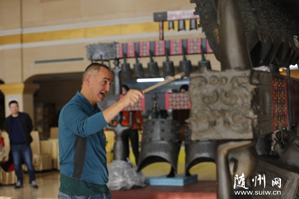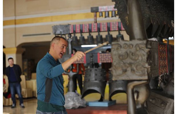魅力中国城复赛随州战队抵达驻地后投入到紧张排练中,图为11月5日德国作曲家老锣(Robert Zollitsch)在指导编钟演奏。 (本报记者 徐 斌摄)