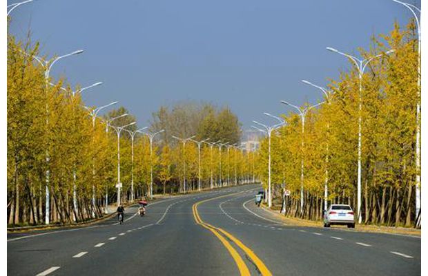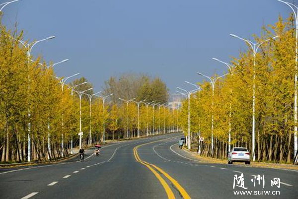 随州网讯 深秋时节,阳光明媚,随州城被金黄色的银杏、梧桐,红色的枫树装点得五彩缤纷,分外美丽。图为白云大道秋景。(本报记者 李文军摄)