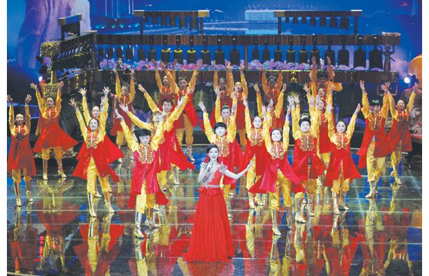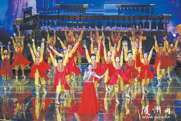 随州网讯 昨日,《魅力中国城》第三轮竞演开机录制,图为随州战队表演编钟乐舞《编钟敲起来》。(本报记者 徐 斌摄)