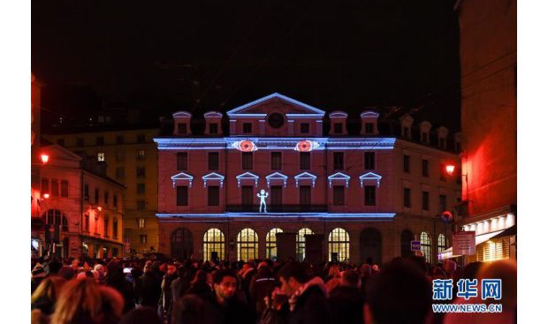 12月7日,观众在法国里昂灯光节上观赏灯光艺术作品“团结”。当日,里昂灯光节在法国里昂开幕。今年的灯光节在里昂市中心和周边的40余处地点设有灯光艺术作品,将持续至12月10日。新华社记者陈益宸摄