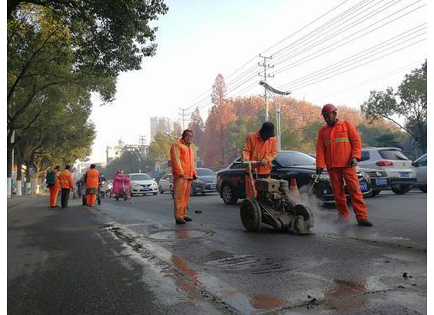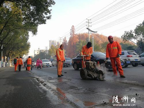 随州网讯 12月11日,随州市政部门对随州城区部分道路进行养护维护作业,提升道路设施完好率,保障市民出行安全。 (本报记者 王璟天摄)
