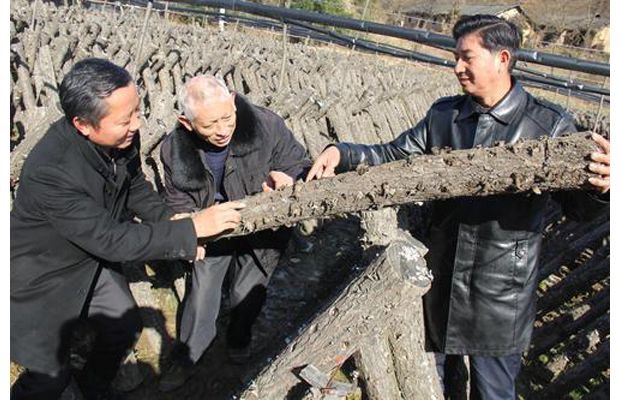 随州网讯 12月17日,随州市食用菌协会会长许景闻(右一)、随州市农业局专家张祥龙(左一)深入随县环潭镇油坊垱村村民张立群的2万棒耳场,解决黑木耳出耳时管理难题。(通讯员 多思摄)