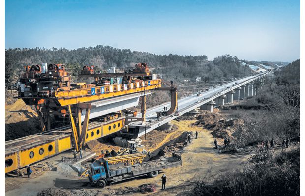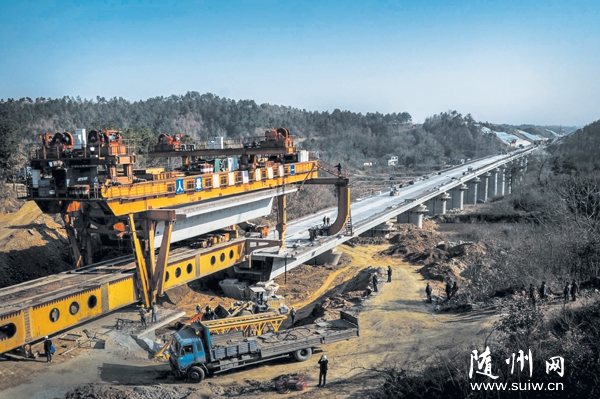 随州网讯 12月18日,汉十高铁随州市至安陆段高架桥最后一梁顺利落墩,标志着随州至安陆高铁建设高架桥全线贯通。(通讯员 刘春潮 叶志刚摄)