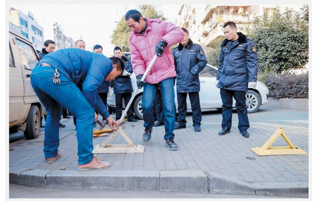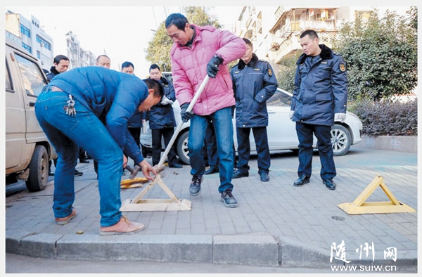 随州网讯 针对饱受市民诟病的临街私设地锁、地桩等违法占道行为,12月19日至20日,随州市城管综合执法局城区分局对随州城区街道两侧地锁、地桩、石墩等障碍物等进行拉网式拆除,还路于民。(本报记者 李文军 摄)