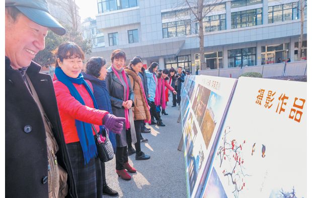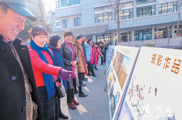 随州网讯 随州老年大学开设的书法、舞蹈、摄影等艺术班受到老年人欢迎,为丰富老年人文化生活搭建了平台。图为市民正在欣赏老年大学2017级摄影班学员的摄影作品展。(本报记者 李文军摄)