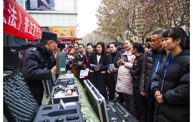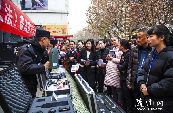 随州网讯 12月28日,随州市反恐办根据国家反恐办和省反恐办统一安排部署,在银泰百货购物中心门前开展反恐普法宣传活动,向群众发放《反恐防范知识手册》,现场解答群众提出的相关问题,集中展示装甲车、无人机、警犬、搜排爆等反恐专业装备。(本报记者 王璟天 通讯员刘智明摄)