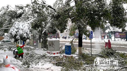 园林工人及时清理树上积雪和被雪压断的树枝,方便市民出行,保障市民安全。(随州网记者王 天摄)
