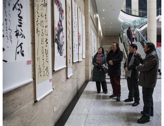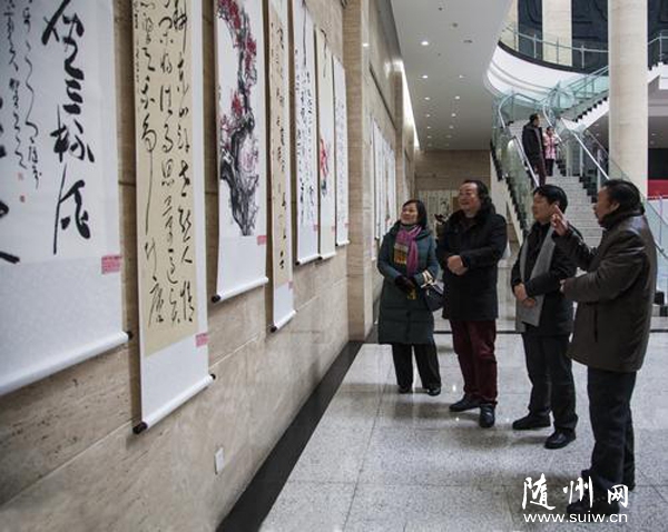 随州网讯 1月上旬,随州市举办“喜庆十九大书画迎新春”精品书画展。书画展由市文联、书协、美协、曾都区文联、区美协等单位共同举办,共征集书法、美术作品120余幅,为市民献上一场色彩斑斓的文化盛宴。(本报记者 王璟天摄)