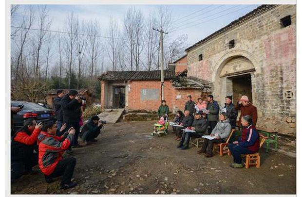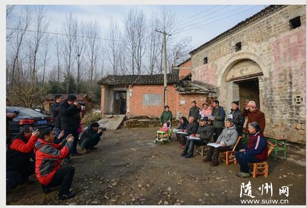 随州网讯 1月17日,湖北省委宣传部、省文联、省摄影家协会组织的“文艺轻骑兵”来到随州市随县草店镇,开展送文化下乡活动,为村民送书籍、拍生活照。图为摄影家们正在为柯家寨留守老人拍摄“全家福”。(本报记者 李文军摄)