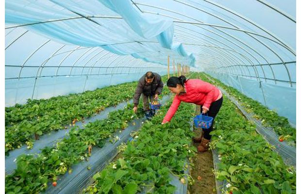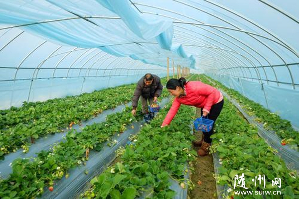 随州网讯 曾都经济开发区新春村精准扶贫户龚道坤在曾都区政协办公室驻村指导组的扶持下种植大棚草莓。3年来,大棚草莓发展到16亩,亩均产值3万元,不仅自己脱贫,而且还带动10余户村民脱贫致富。(本报记者 李文军摄)