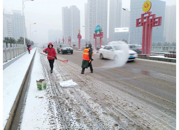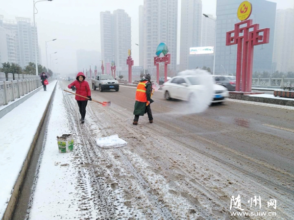 随州网讯 1月24日下午,随州市环卫局职工在随州城区府河大桥抛撒工业盐融雪,保障大桥交通畅通安全。(本报记者冯家园 摄)