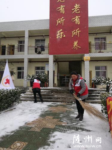 随州网讯  1月25日,广水市红十字会志愿服务队的队员们来到应山福利院,走访慰问孤寡老人,帮老人们收拾内务、打扫院内外积雪。 (特约记者彭晓华 通讯员程开军摄)