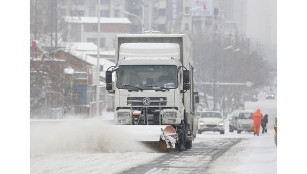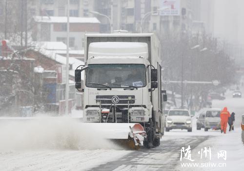 随州网讯 昨日,曾都区城乡规划建设局组织400余人、3台雪车、1台融冰车除雪。图为铲雪车在随城青年路大桥清除积雪。(本报记者 徐 斌摄)