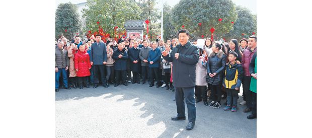 春节在即,村里照全家福、写春联福字、包汤圆等新春民俗活动丰富多彩。习近平每到一处,都驻足同群众交流,他说:“我是人民的勤务员,让人民过上好日子是我们共产党人的初心、宗旨。”临行前,村民们欢呼着簇拥上来向总书记拜年,习近平热情同村民们打招呼,祝乡亲们安逸舒适、新春快乐、阖家幸福。