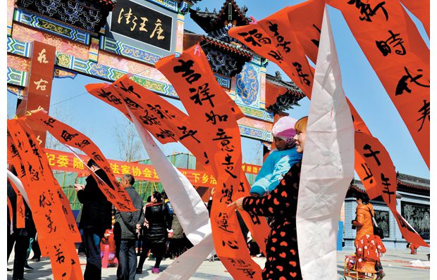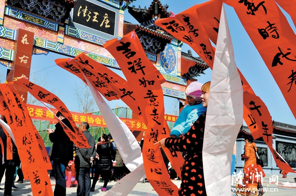 随州网讯 2月12日,腊月廿七,随县纪委在均川镇唐王广场举办随县书法家协会送“廉”、送文化下乡活动。广场一侧,书法家们现场泼墨挥毫,书写春联;另一侧,新时代随州讲习普纪“大篷车”进行巡演,让群众在家门口享受廉政文化大餐。(本报记者 李文军 通讯员 韩铁流摄)