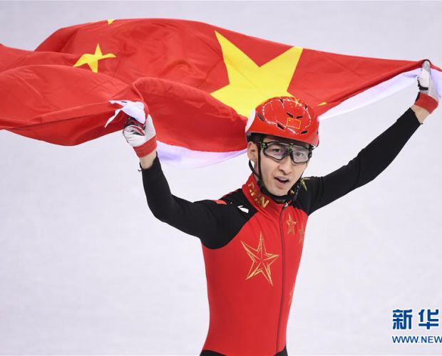 2月22日,武大靖庆祝胜利。当日,在江陵冰上运动场举行的2018年平昌冬奥会短道速滑男子500米决赛中,中国选手武大靖夺冠,这是中国代表团在本届冬奥会上的首枚金牌。新华社记者鞠焕宗摄