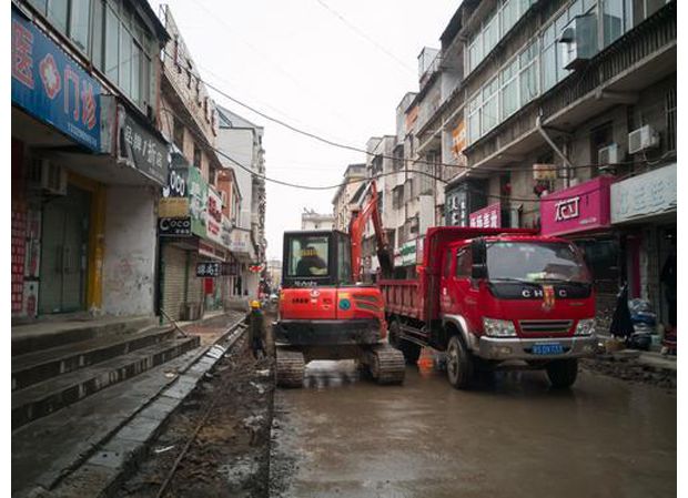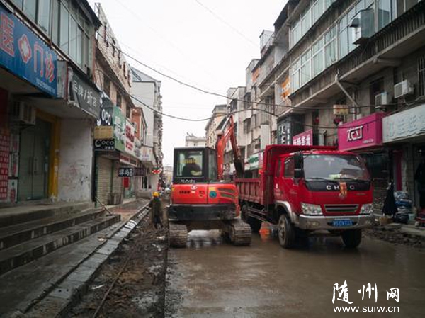 随州网讯 新春伊始,随城聚玉街改造项目如期复工,图为2月27日工人们冒雨施工。(本报记者 徐斌 摄)