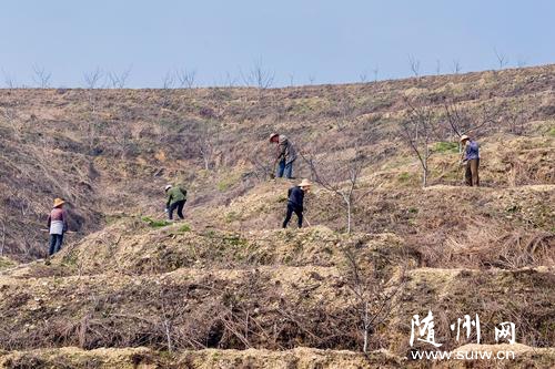 ▲3月14日,湖北丰年公司员工正在万亩经济林基地为核桃树苗松土除草。