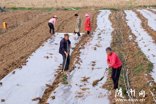 ◀3月15日,随县尚市镇净明铺居委会村民正在播种土豆。