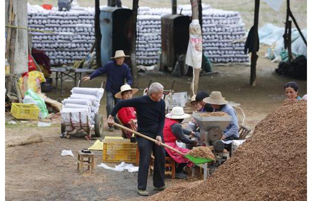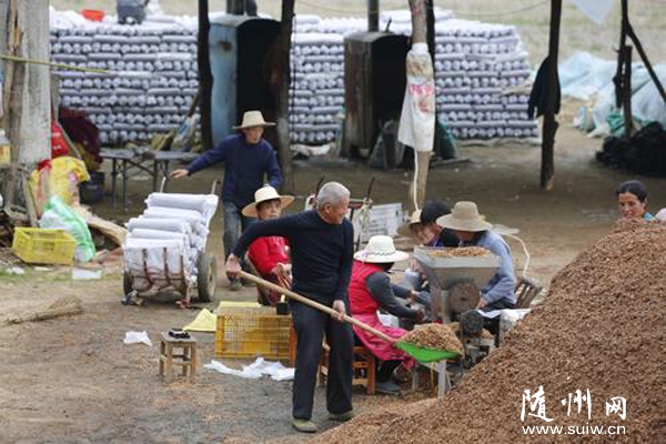 随州网讯 当前正是种植春栽香菇的关键时期,香菇种植大镇随处可见菇农们在拌料、装袋、制作菇筒。图为3月15日,曾都区洛阳镇小岭冲村的菇农正在做香菇袋料。(本报记者 徐 斌摄)