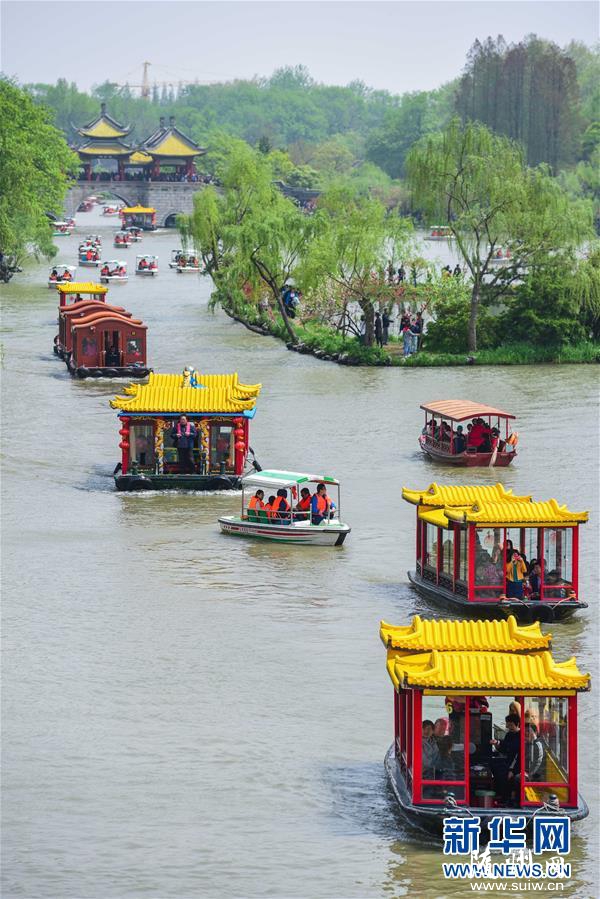 4月6日,游客乘船在江苏扬州瘦西湖景区内游览。清明小长假期间,人们纷纷走出家门乐享假期。新华社发 刘江瑞 摄