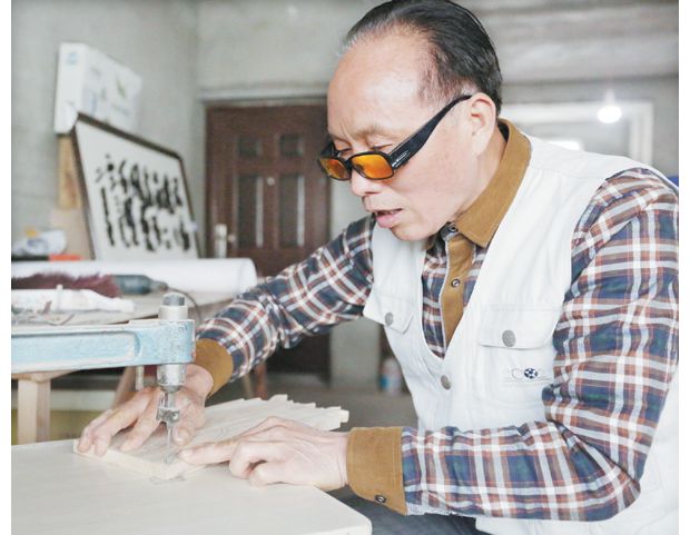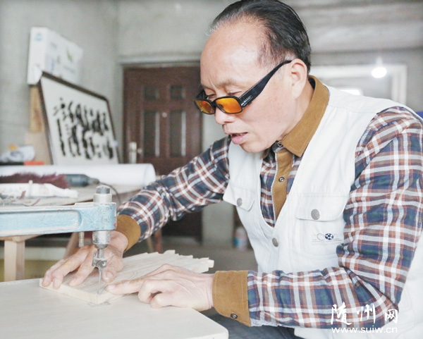 4月12日,位于曾都区北郊孔家坡的何立洲工作室内,雕刻机“咚咚咚”地低声轰鸣,何立洲将描好字的香樟木料放在雕刻机上,用力摁住。锯条沿着铅笔线缓缓行进,木屑四飞。10分钟后,锯条在木料上“画”了一个蜿蜒的“毛”字,回到起点。