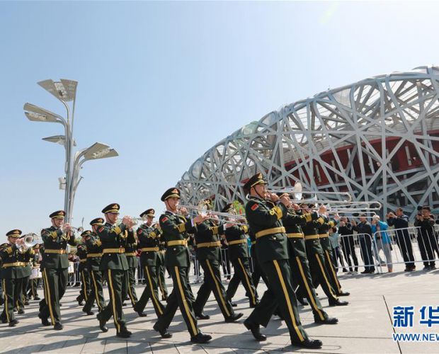 当日,“和平号角-2018”上海合作组织第五届军乐节参演军乐团在北京奥林匹克公园举行军乐巡游表演。