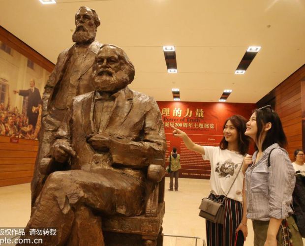 2018年5月5日,由中宣部、中央党史和文献研究院、中国文联共同主办的“真理的力量——纪念马克思诞辰200周年主题展览”在中国国家博物馆开幕,展览分“伟大革命导师马克思的壮丽人生”“马克思主义中国化的光辉历程”“新创作马克思主义题材美术作品”3个部分,展出马克思、恩格斯、列宁手稿、笔记本及亲笔签名的书籍原版等珍贵文献100余件,原版图书900余种,图片150余幅,马克思主义题材美术作品70余幅,雕塑作品6尊等,全景式展示了马克思的生平、革命实践、理论贡献和精神境界,展现了马克思主义在中国传播运用和丰富发展的光辉历程。展览将持续到8月5日。陈晓根/摄