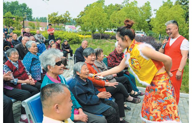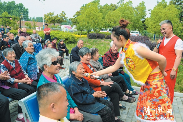随州网讯 “世上只有妈妈好......”5月10日,楚苑生态疗养院里充满欢声笑语。随州刘秀艺术团全体演员特意编排了一场精彩的文艺节目,为该院老人送去母亲节的慰问。(本报记者 李文军摄)