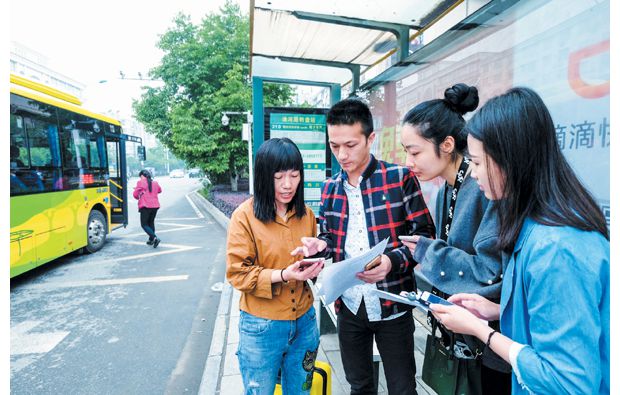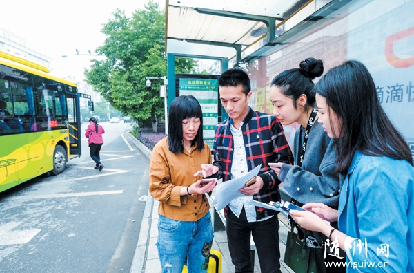 随州网讯 5月11日,“随州掌上公交”APP正式上线,市民通过手机可实时查询公交线路和出行方案。图为市民正在清河路公交站下载体验“随州掌上公交”APP。(本报记者 李文军摄)