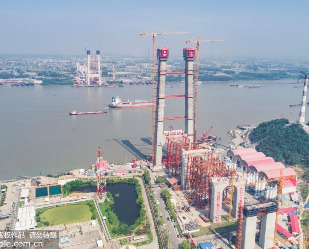 2018年5月15日,由上海铁路局建设、中铁大桥院设计、中铁大桥局施工的五峰山长江大桥主塔成功封顶,标志着我国首座公铁两用悬索桥建设取得阶段性胜利。据了解,大桥全长6.409千米,主跨1092米,上层为双向八车道高速公路,设计时速为100公里。下层为四线高速铁路(预留两线),设计时速为250公里, 是世界首座高速铁路悬索桥。谢道韫/人民图片