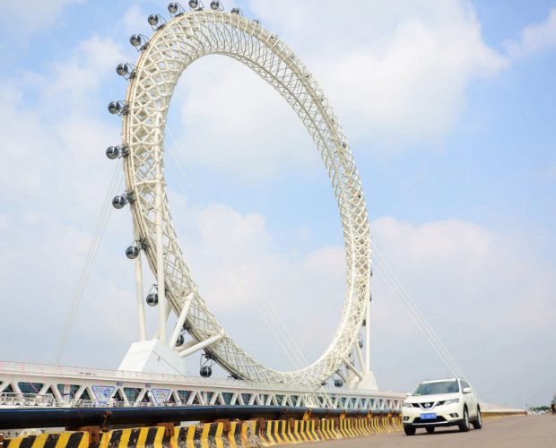 “渤海之眼”摩天轮创下三项世界之最:世界上最大的无轴式摩天轮,世界上首例编织网格形式的摩天轮,世界上首次无轴式轮桥合一摩天轮。该摩天轮采用无轴式轮桥一体化设计,轮盘直径125米,总高度145米,有36个悬挂式观景舱,每个可以乘坐8-10人,绕完一周游程为30分钟。韦鹏/东方IC