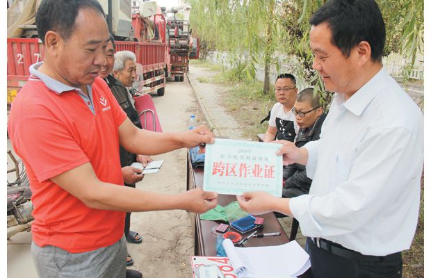 随州网讯 近日,随县农机监理站工作人员带着宣传牌、年检年审证、跨区作业证、安全责任书,到新街镇农机手家中为农机办证。图为机手喜领跨区作业证。 (通讯员 石宏涛 摄)