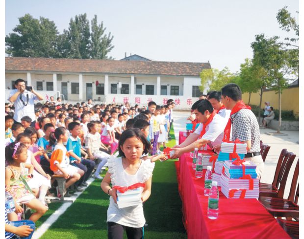 随州网讯 5月17日,湖北犇星化工向随州高新区淅河镇十岗小学捐赠1000多册图书,丰富孩子们课外阅读。据悉,该公司设立了捐资助学基金,每年筹资近30万元用于扶贫助学。 (本报记者 冯家园摄)