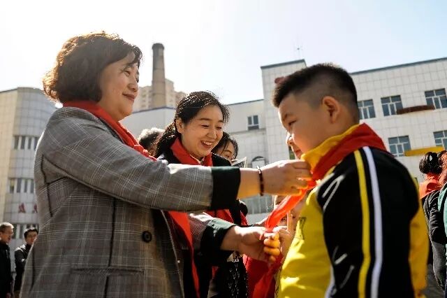 2018年4月13日,新疆教育学院实验小学一年级学生参加入队仪式。新华社记者 王菲 摄