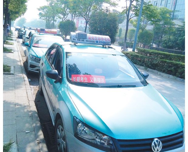随州网讯 近日,市客管处抽调100辆车况好、驾驶员素质高的出租汽车组成送考车队,于高考期间免费接送高考学生,为随州高考加油助力。 (本报记者 王璟天 摄)