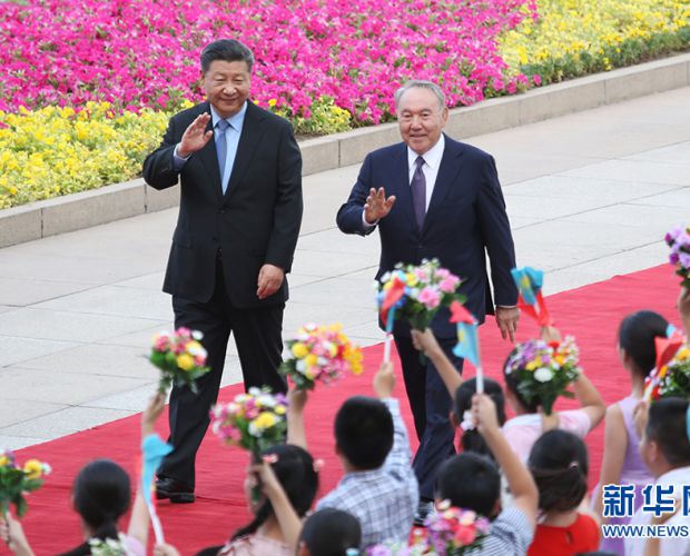 6月7日,国家主席习近平在北京人民大会堂同哈萨克斯坦总统纳扎尔巴耶夫举行会谈。这是会谈前,习近平在人民大会堂东门外广场为纳扎尔巴耶夫举行欢迎仪式。新华社记者 姚大伟 摄