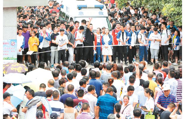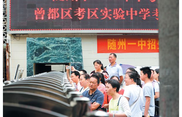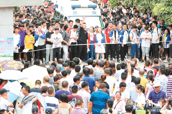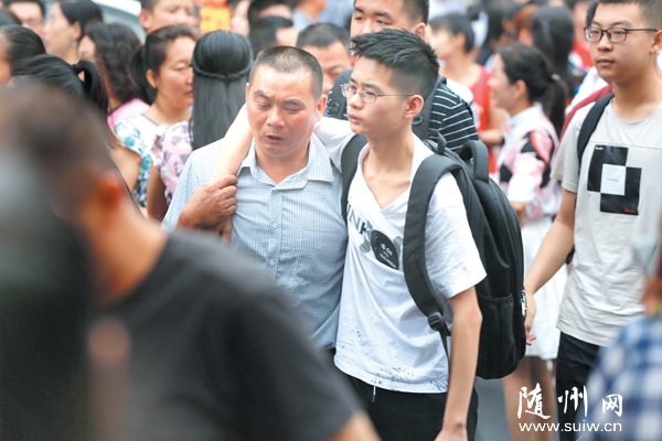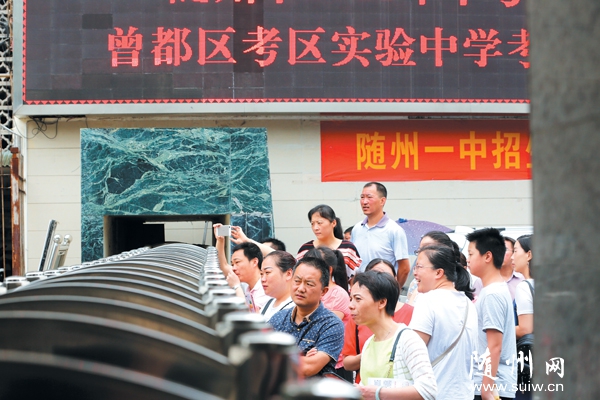 首场考试结束后,在曾都区实验中学考点警戒线内等待放行的考生向考场外的家长招手示意。