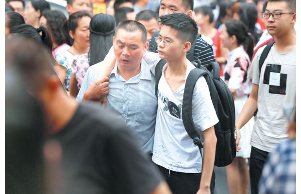 一名考生在家长的搀扶下走进考场。 (本报记者徐斌摄)