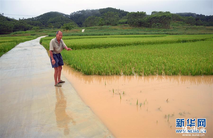 6月23日,广西南宁市上林县乔贤镇乔贤村一村民查看被洪水淹没的稻田。
