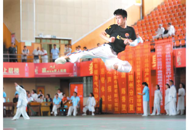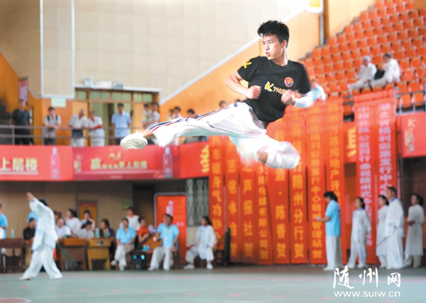 随州网讯 近日,2018年随州市武术公开赛举行,21支代表队共200多名运动员参加比赛。图为一名参赛者在比赛中做出飞腿动作。(本报记者 徐斌摄)