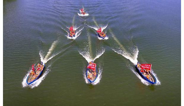 随州网讯 随州军分区近日组织民兵开展抗洪抢险集训。图为6月28日民兵应急分队在白云湖进行冲锋舟演练。(本报记者 徐 斌摄)