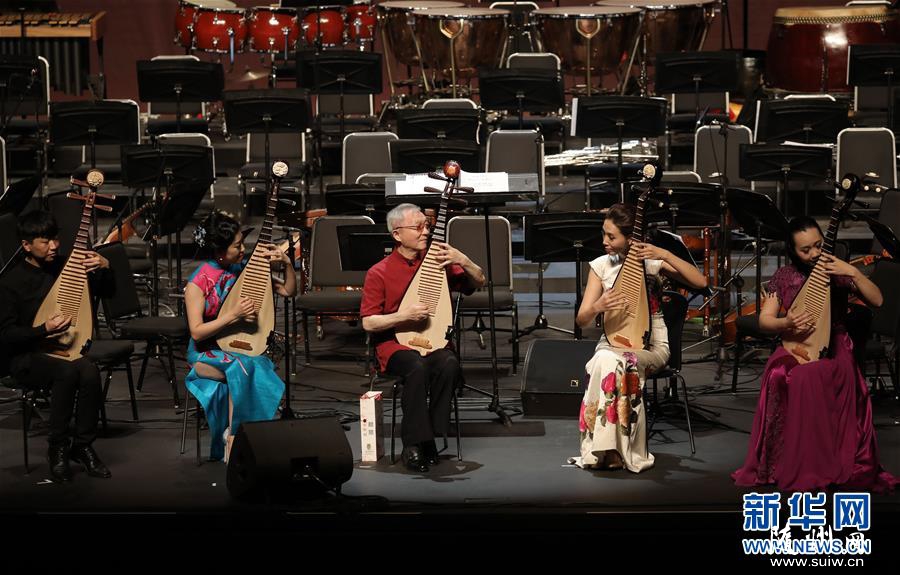71日晚,中央民族乐团演奏家在上海大剧院演出琵琶齐奏《飞花点翠》。71日,上海民族乐器一厂迎来60华诞。新华社发(旻一 摄)