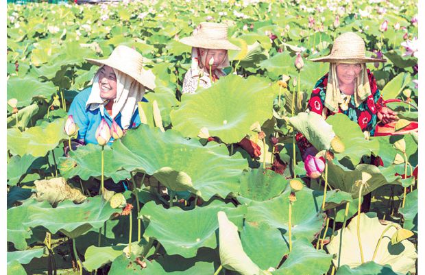 随州网讯 广水市城郊街道办事处油榨桥村引进湖北鑫绿生态农业有限公司投资300多万元,种植太空莲1050亩,吸引大量游客观光休闲。该村太空莲产业采取“企业主体、群众参与”机制,目前已有96个农户入股参与,公司日常管理用工优先考虑本村贫困村民。图为村民正在采莲蓬。(通讯员 熊言澄摄)
