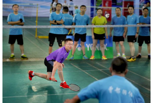 随州网讯 7月7日,曾都区业余羽毛球混合团体公开赛开幕,16支代表队150多名选手参加了比赛。(本报记者 徐斌摄)