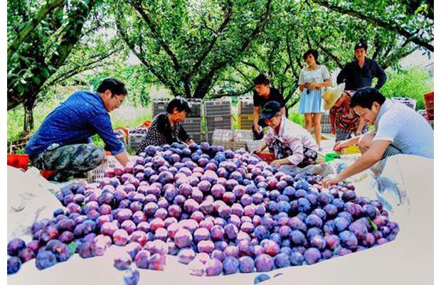 随州网讯 7月10日,随县厉山镇灯塔村果农赵学文10多亩宝石李被武汉果商抢购一空。图为赵学文组织民工对水果进行分选和装箱。 (本报记者 李文军 通讯员 韩铁流摄)