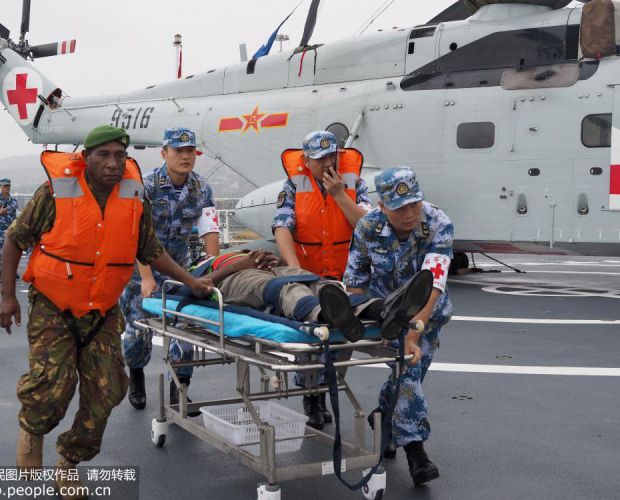当地时间2018年7月17日上午,正在执行“和谐使命-2018”任务的中国海军和平方舟医院船官兵,与巴布亚新几内亚军地医务工作者在莫尔斯比港成功举行了一场联合应急医学救援演练。