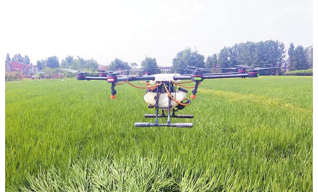 随州网讯 近日热浪炙人,随县农科所启用喷气式无人机喷施农药,防治水稻病虫害,避免人工喷药高温中暑。 (通 讯 员龚承斌 罗清堂摄)